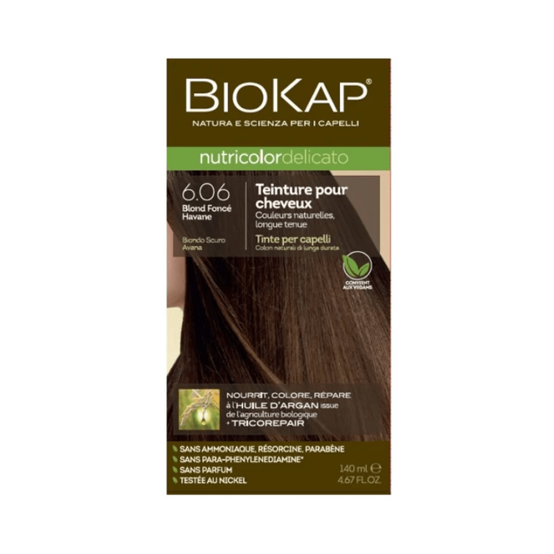 Biokap Nutricolor Delicato 6.06 Blond Foncé Havane propose une alternative douce aux colorations capillaires classiques, notamment pour les cuirs chevelus sensibles ou irrités par les produits agressifs. L'huile d’argan, riche en acides gras essentiels, contribue à nourrir la fibre capillaire et améliore la souplesse des cheveux après la coloration.