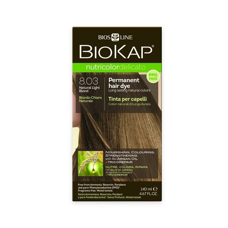 Biokap Nutricolor Delicato Blond Clair Naturel 8.03 associe performance colorante et haute tolérance. Sa formule sans ammoniaque, enrichie en extraits végétaux, convient aux cuirs chevelus sensibles et aux cheveux fragiles.