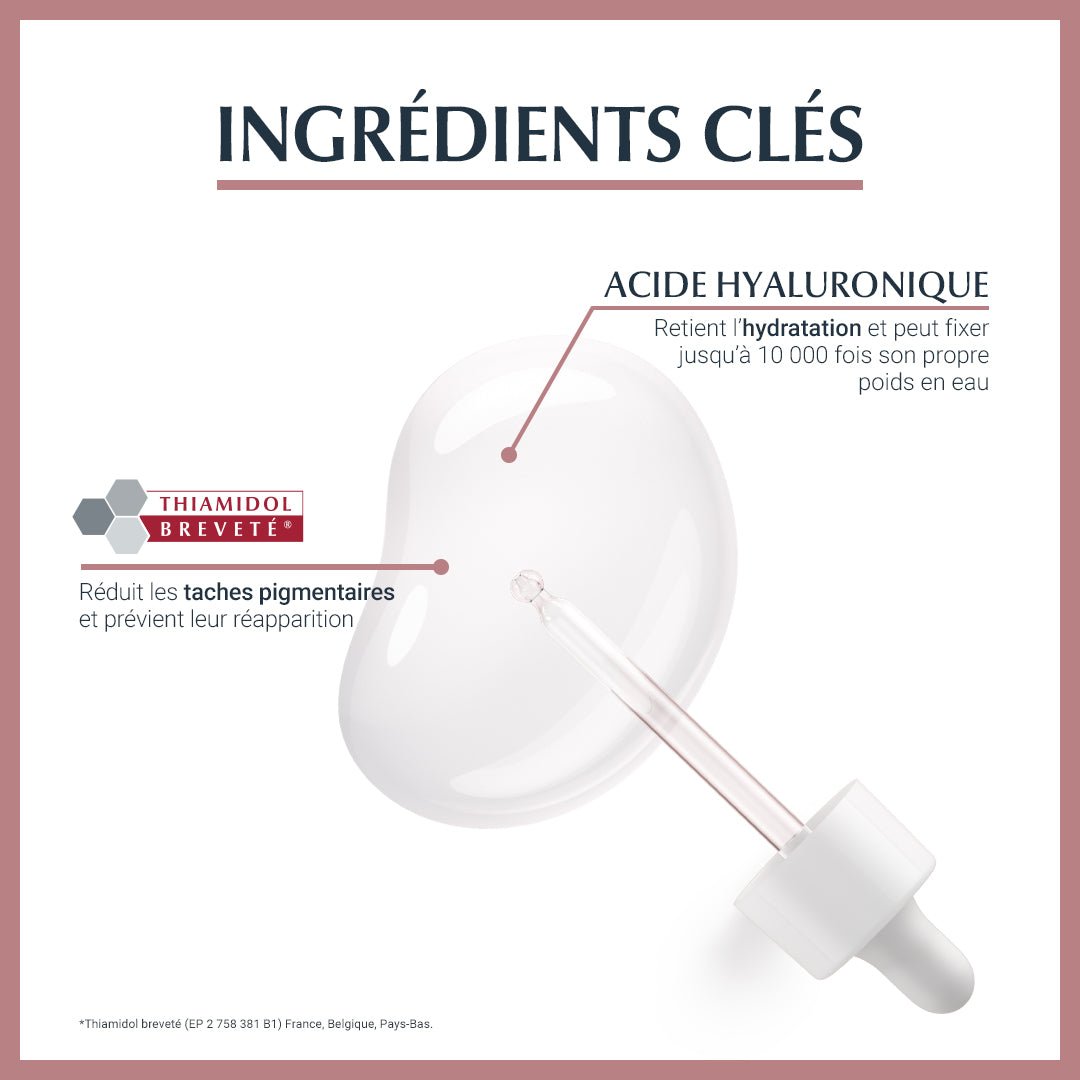 Thiamidol : Inhibe l’activité de l’enzyme responsable de la production excessive de mélanine, réduisant progressivement les taches existantes et limitant leur réapparition.