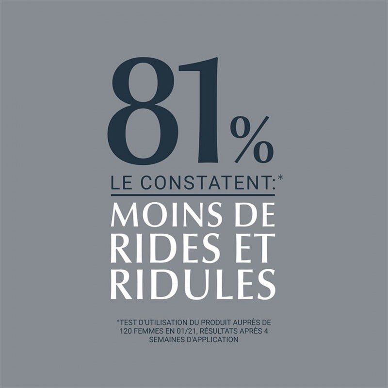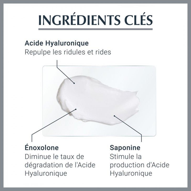 Un troisième actif, l'enoxolone, freine la dégradation de l'acide hyaluronique déjà présent dans la peau. Ce mécanisme permet de renforcer l'efficacité globale du soin, notamment sur les rides installées.