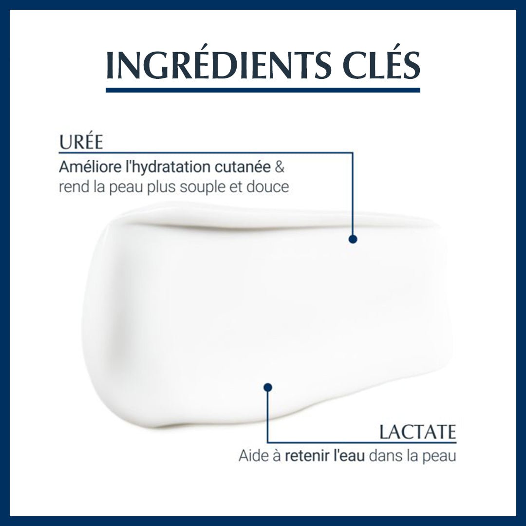 Hydratation ciblée : Grâce à l’association de l’urée (5 %) et du lactate, deux agents naturellement présents dans la peau, cette formule aide à améliorer la rétention d’eau dans les couches superficielles de l’épiderme. Elle participe ainsi à limiter la perte insensible en eau, fréquente chez les peaux très sèches.