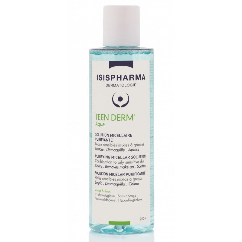 Teen Derm Aqua est une solution micellaire spécifiquement formulée pour les peaux à tendance acnéique. Elle combine des agents nettoyants doux et des actifs séborégulateurs pour éliminer l’excès de sébum, limiter l’obstruction des pores et apporter une sensation de fraîcheur immédiate après usage.