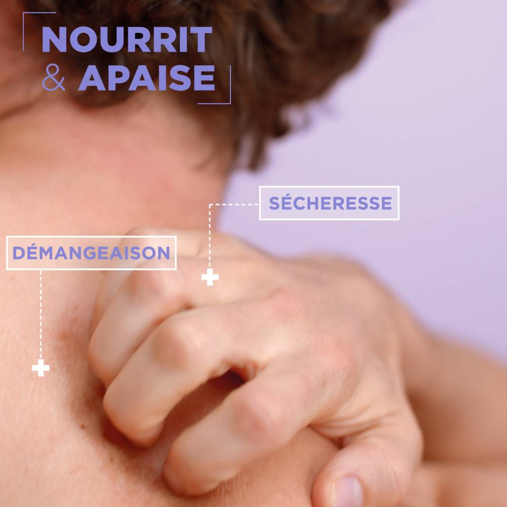 Appliquer sur peau légèrement humide après la douche, en massant jusqu’à absorption. Une seconde application dans la journée peut être utile en cas de sécheresse persistante ou d’inconfort localisé.