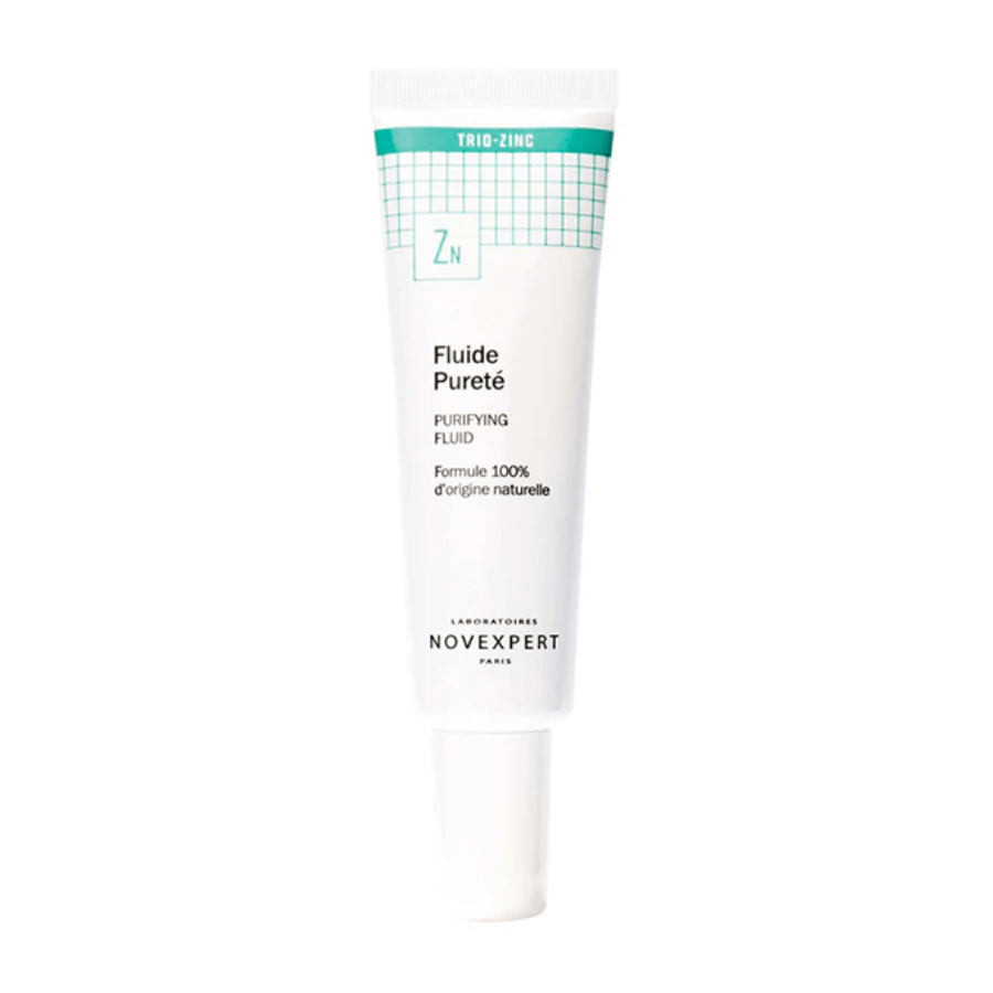 Novexpert Fluide Pureté Trio-Zinc associe du zinc, de la gluconolactone et des extraits végétaux pour limiter les imperfections, freiner l’excès de sébum et prévenir l’oxydation liée à l’inflammation cutanée.