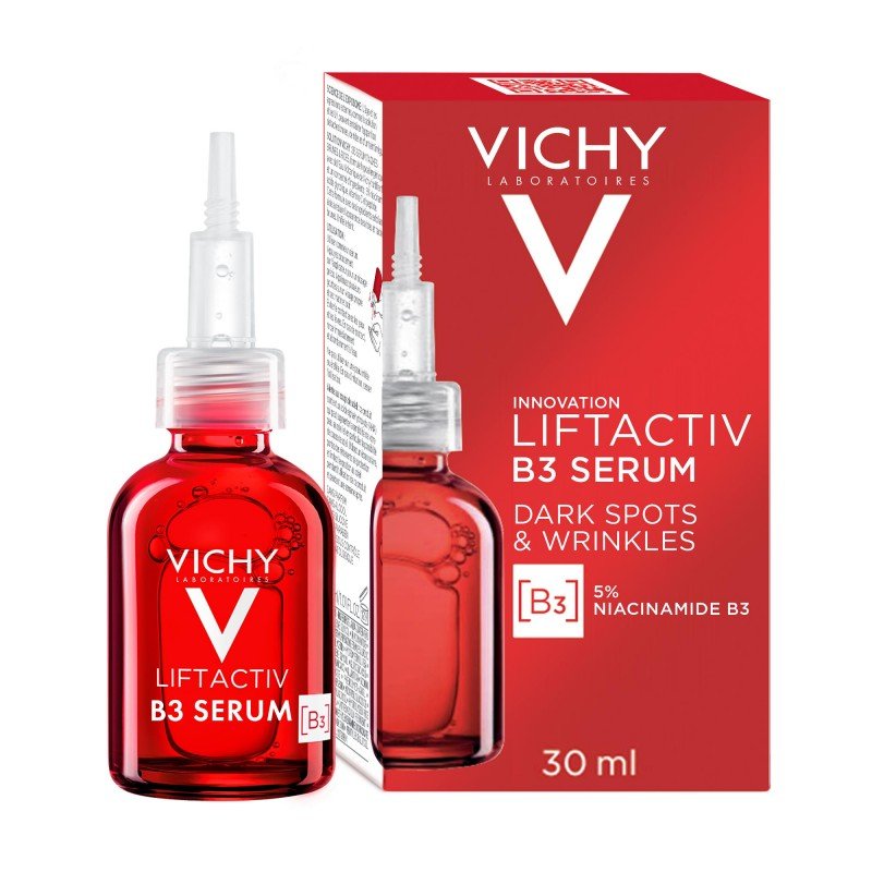 Vichy Liftactiv Specialist Sérum B3 cible les taches brunes et lisse les rides, tout en améliorant la texture de la peau pour un teint uniforme et éclatant, visiblement plus jeune.
